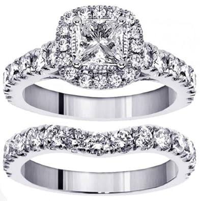 This stunning large diamond encrusted engagement ring set is adorned with a magnificent center diamond giving this ring an incomparable shine. The center diamond of this astonishing ring is a 0.72 Ct princess cut 100% natural gem with a spectacular colorless F-G grade and an absolutely eye clean VS2-SI1 clarity surrounded by gorgeous halo set diamonds. This beautiful bridal set is expertly crafted from luxurious 14k gold prong set mounting covered with F/G-color and VS2/SI1 clarity 2.28 Ct round large and clear diamonds. Also available in 18k gold or platinum.